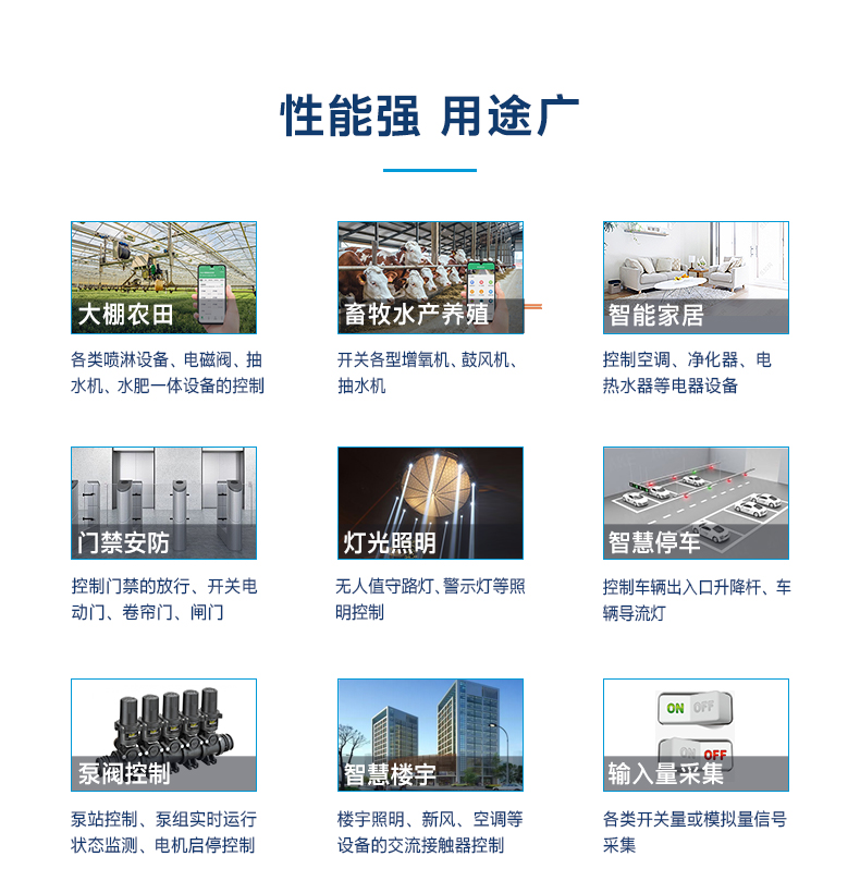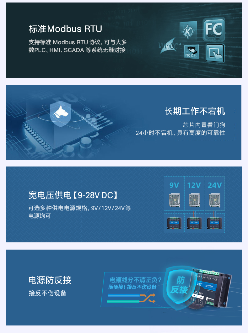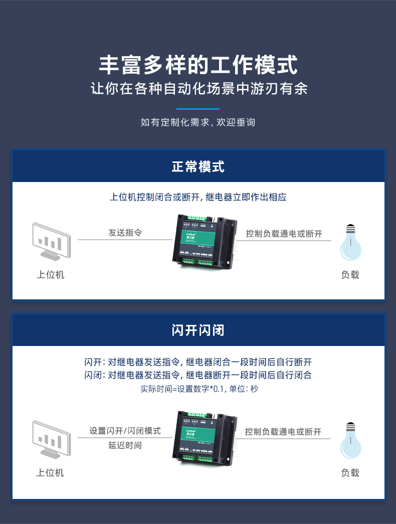 工作模式更改;继电器独立控制;继电器整体控制;开关量状态查询;调试信息查询;控制软件;支持各家组态软件;支持 Labview 等